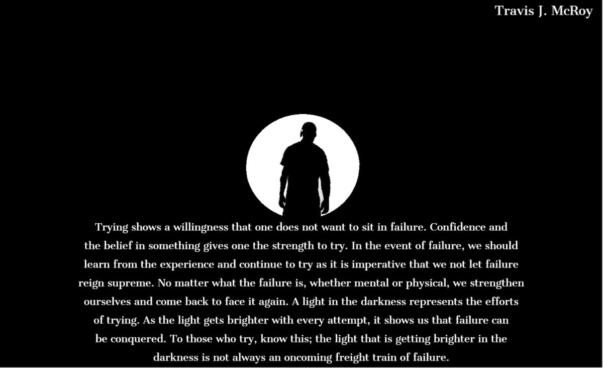 Trying shows a willingness that one does not want to sit in failure. Confidence and the belief in something gives one the strength to try. In the event of failure, we should learn from the experience and continue to try, as it is imperative that we not let failure reign supreme. No matter what the failure is, whether mental or physical, we strengthen ourselves and come back to face it again. A light in the darkness represents the efforts of trying. As the light gets brighter with every attempt, it shows us that failure can be conquered. To those who try, know this; the light that is getting brighter in the darkness is not always an oncoming freight train of failure.