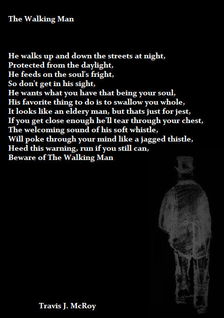 It’s hard to believe that this little doggerel style poem turned into a Twenty Chapter Novel for me: The Walking Man: He walks up and down the streets at night,Protected from the daylight.He feeds on the soul’s fright,So, don’t get in his sight.He wants what you have that being your soul,His favorite thing to doContinue reading “A Poem and The Seed of Thoughts”